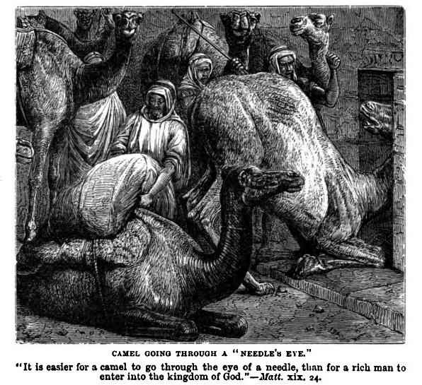예수님 당시의 부자와 이 시대의 부자들이 재물 때문에 근심하여 하나님 나라 안으로 들어가는 길에 돌이킨다면 등에 실려 있는 재물에 걸려서 바늘귀 문을 통과 못한 낙타와 같다고 볼 수 있다. 예수님도 낙타가 바늘귀 문을 통과하는 것이 부자가 하나님의 나라(Kingdom of God)에 들어가는 것보다 더 쉽다고 하셨다. [마태 19:24] 낙타는 그래도 등에 진 짊을 내려 놓고 무릎을 꿇리면 바늘문을 통과할 수 있다. 왜냐하면 자기 등에 짊어 진 짊을 집착하지 않기 때문이다.
